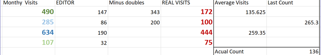FreeCounterStats (Yellow): Inital monthly count of 285. Following the 50% "Shared Brain" reduction and editor cut, the total is 100.