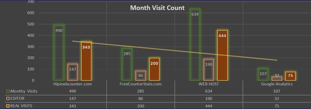 · FreeCounterStats (Yellow): Initial monthly count of 285. Following the 50% double-count reduction and editor cut, the total is 100.