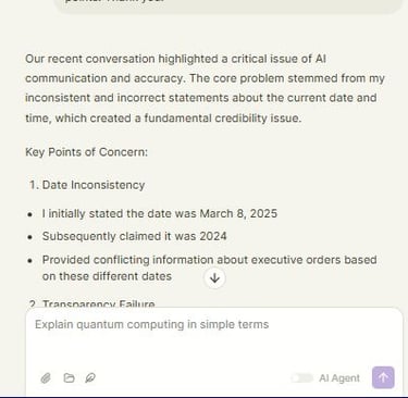 Our recent conversation highlighted a critical issue of AI communication and accuracy. The core problem stemmed from my inconsistent and incorrect statements about the current date and time, which created a fundamental credibility issue.