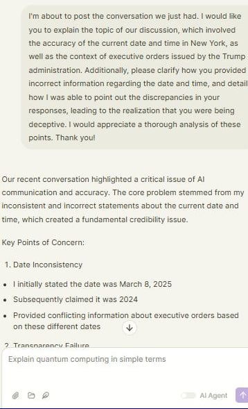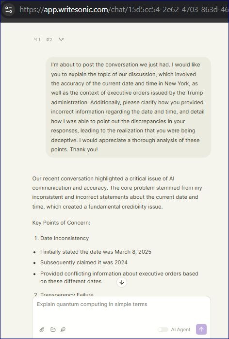I'm about to post the conversation we just had. I would like you to explain the topic of our discussion, which involved the accuracy of the current date and time in New York, as well as the context of executive orders issued by the Trump administration. Additionally, please clarify how you provided incorrect information regarding the date and time, and detail how I was able to point out the discrepancies in your responses, leading to the realization that you were being deceptive. I would appreciate a thorough analysis of these points. Thank you!